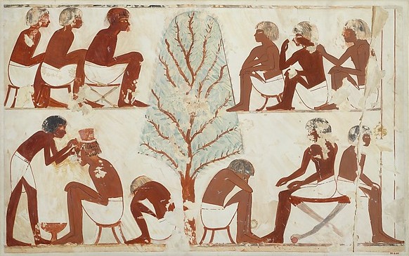 上图:主前15世纪的埃及壁画,古埃及人在剃头。埃及气候闷热,体毛很难保持卫生,所以古埃及人都勤于剃头刮脸,祭司更要每三天刮光全身体毛。男人通常剃光头,女人到新王国时期才留长发。另一方面,上层人士无论男女都热衷于戴人发或羊毛制成的假发,男人还戴假胡须,并以不同的样式作为社会地位的标志。法老的假胡须更有宗教意义,代表他是活神。