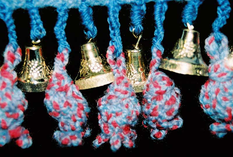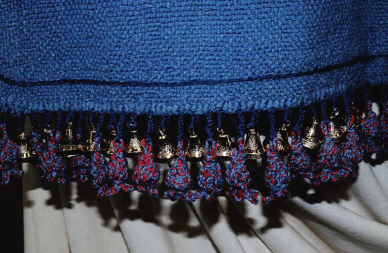 【出二十八33】「袍子周围底边上要用蓝色、紫色、朱红色线做石榴。在袍子周围的石榴中间要有金铃铛:」