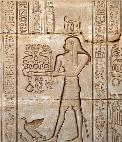 上图:一个古埃及人向哈索尔Hathor女神献上「摇祭」。所谓「摇祭」就是将祭物先交给祭司,在祭坛高举向天,表示已经献给神,然后放在祭坛上,再从祭坛上取下来,作为祭司的食物。这种「动作上的转换」称之为「摇祭」。也有人认为「摇祭」是「将祭物拿在手中摇动」。