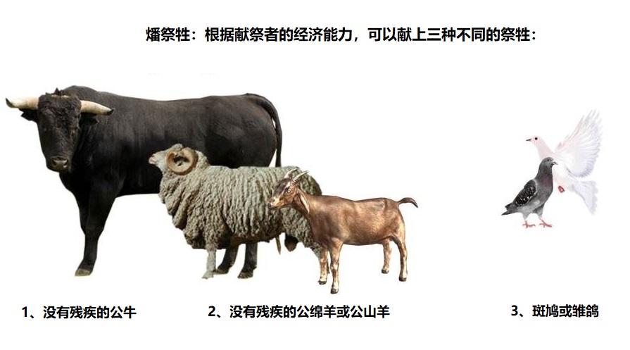 - 牛、羊需要献祭者自己亲手宰杀。但鸟的血量很少,所以需要由熟练的祭司宰杀,以便迅速地用血抹祭坛。穷人只需要提供鸟,但他们已尽了最大的努力,这是神所悦纳的。