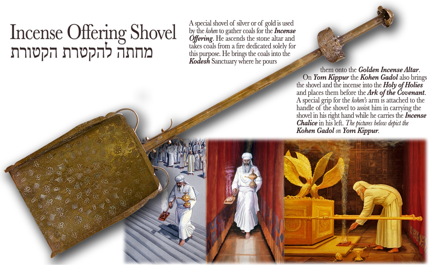 上图:以色列圣殿研究所制作的献香铲子(香炉),用金或银做成,用来从燔祭坛上取炭带进圣所,放在金香坛上。在赎罪日,这铲子也用来「从耶和华面前的坛上盛满火炭,又拿一捧捣细的香料,都带入幔子内,在耶和华面前,把香放在火上,使香的烟云遮掩法柜上的施恩座」(利十六12)。