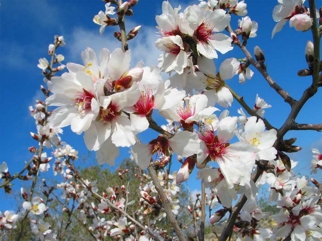 上图:在大卫打败歌利亚的以拉谷,每年早春杏花盛开。以色列的杏树就是扁桃树(Prunus amygdalus),每年阳历1、2月间开粉红色或白色的花,花有5瓣,先开花后长叶,是当地春天最早开花的树。杏树的树形、初熟的果实与桃树相似,成熟后果实会裂开,露出其中的核,核里就是杏仁。