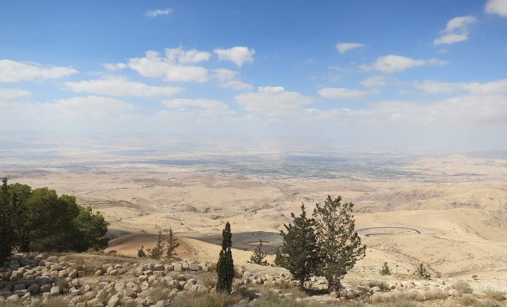 上图:从毗斯迦山/尼波山远眺应许之地。毗斯迦山可能就是现代的Ras es-siyagha,是亚巴琳山脉中第二高峰,海拔约800米,与尼波山相连,可以俯瞰死海和迦南地。亚巴琳是摩押高原西方边缘上的一大片陡峭的斜坡。