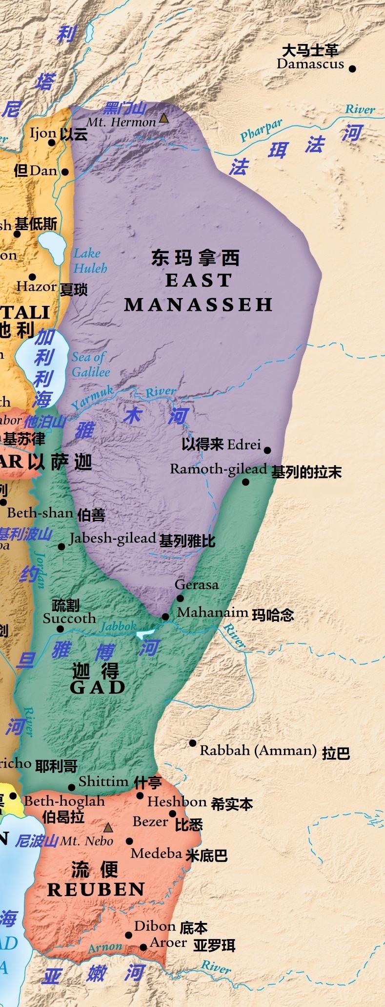 - 9-12节是摩西分给河东两个半支派的产业,南界是「亚嫩谷」(9节),北界是「黑门山」(11节)。具体位置和范围参见地图。