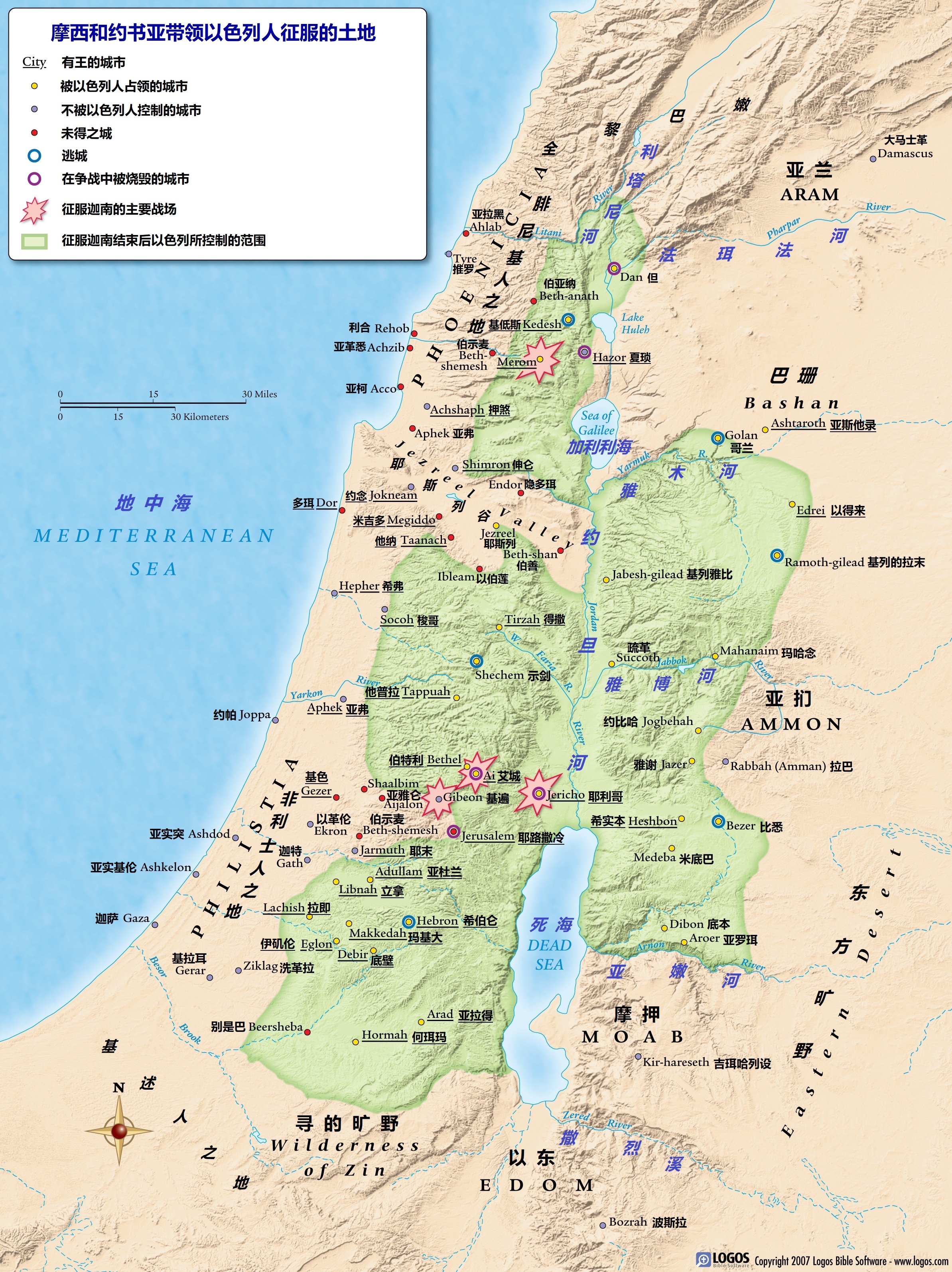 - 「约书亚和这诸王争战了许多年日」(十一18),用了七年时间打败了迦南诸王、征服了主要城邑。虽然此时约书亚已经年近九十,但并不是因为他「年纪老迈了」(1节)、不能打仗了,所以才留下许多遗憾,「还有许多未得之地」(1节)。神所使用的器皿,并不在乎年龄或体力,只在乎信心和顺服;神所定意的工作,并不根据人的所有和所是,只根据神的旨意和大能。征服迦南的争战,乃是神自己带领百姓争战:是神大能的手施行神迹奇事,用四次闪电战消灭迦南诸王;也是神定意「将这些国的民从你面前渐渐赶出」(申七22),吩咐百姓「不可把他们速速灭尽,恐怕野地的兽多起来害你」(申七22),所以留下了「许多未得之地」。