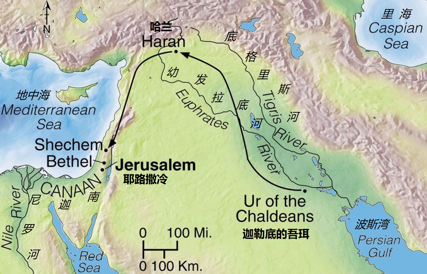 上图:亚伯拉罕从吾珥到迦南的路线,全程约1900公里。「亚伯拉罕和拿鹤的父亲他拉,住在大河那边事奉别神」(书二十四2),神呼召亚伯拉罕离开了幼发拉底河那边的老家吾珥。他们可能是沿着幼发拉底河西岸的商业大道前往迦南,沿途经过巴比伦、利马、哈兰和大马士革等城市,从吾珥到哈兰大约1100公里,从哈兰到迦南地大约800公里。亚伯拉罕信靠神,凭信心走完了这段漫长的路程,所以圣经说:「亚伯兰信耶和华,耶和华就以此为他的义」(创十五6)。