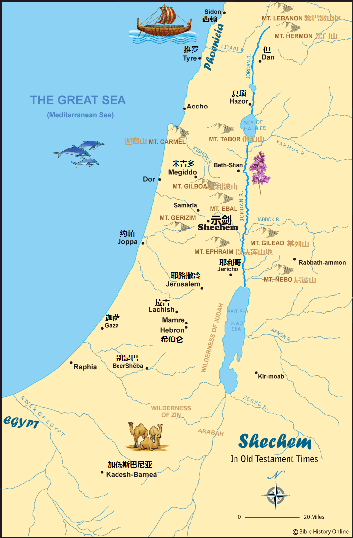 - 「示剑」(1节)位于迦南地的中部,是南北大道与东西大道的交叉口。亚伯拉罕进入迦南地之后,首先在示剑为神筑坛,神在这里第一次与亚伯拉罕立约(创十二6-7);雅各全家从亚兰回到迦南,首先在示剑为神筑坛、清除偶像(创三十三18-20;三十五4);而以色列人进入迦南之后,也首先在示剑筑坛,并在基利心山和以巴路山上宣告祝福和咒诅,立志顺服圣约(八30-35)。因此,约书亚将百姓召集到示剑,正是为了在这个特殊的地方从头数算神的恩典(2节),激励百姓坚定与神所立的约。