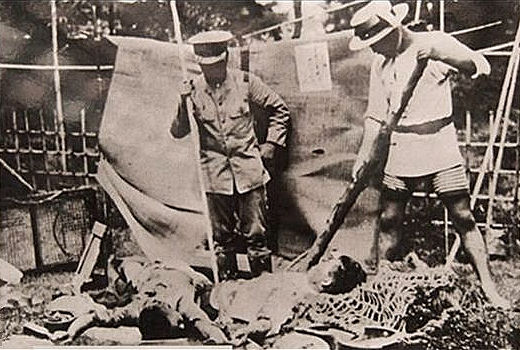 上图:1923年日本关东大地震发生后,日本军警正准备用竹矛刺杀朝鲜移民。「示播列(Shibboleth)」特指区别一个人的社会或地区背景的指标,通常是指语言特征,特别是对一个词的发音,用来标识说话者是否属于某一特定群体的成员。关东大地震损失惨重,灾区谣传朝鲜移民趁乱放火、投毒,许多地方乘机屠杀朝鲜人。由于朝鲜语中没有浊音,日本军警就用「十五円五十銭」作为「示播列」来盘查路人,如果有人发音不标准,就有可能被当作朝鲜人当场杀害。当时可能有6000多许多朝鲜人和700多中国人因此被杀。