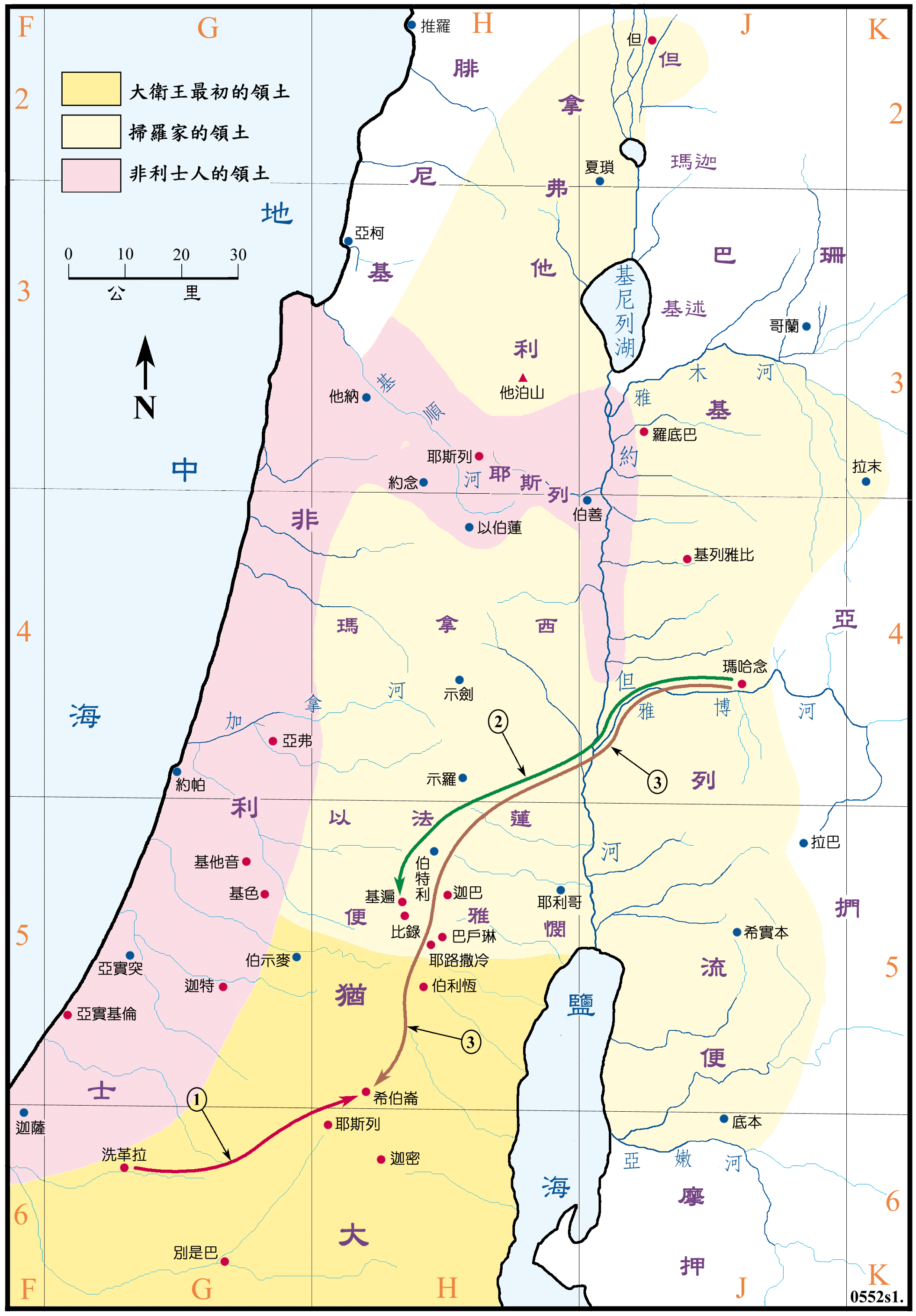 上图:大卫在希伯仑作犹大和以色列王:1、犹大人在希伯仑膏大卫作犹大家的王(撒下二1-4),扫罗的儿子伊施波设在玛哈念作以色列王两年六个月,统治除了犹大地以外各支派已佔有之地,其间犹大人和以色列人常有战争,但以色列渐衰(撒下二8-10);2、伊施波设的元帅押尼珥,领人从玛哈念到基遍去,与犹大的勇士对阵,前者大败,死了三百六十人,但犹大人只死了十九人(撒下二12-31),押尼珥要归顺大卫,但在希伯仑被约押所杀,大卫为押尼珥哀悼(撒下三12-39);3、伊施波设被他的两个军长利甲和巴拿所杀,又割下他的首级拿到希伯仑去献给大卫,但被大卫所杀(撒下四5-12),以色列人到希伯仑膏大卫作以色列人的王,以色列从别是巴到但再度统一(撒下五1-5)。