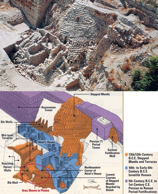 上图:考古学家在大卫城遗址挖掘出来的主前13-12世纪的「阶梯石构」(Stepped Stone Structure),这是一个用小石块堆砌成的地基和护土坡,高度超过15米,很可能就是撒下五9提到的「米罗」。大卫城建在陡峭的山坡上,必须先用地基和护土坡搭一个平台,然后才能在平台上建筑城墙。即使是在城里,也必须先平整地基,才能建造房屋。