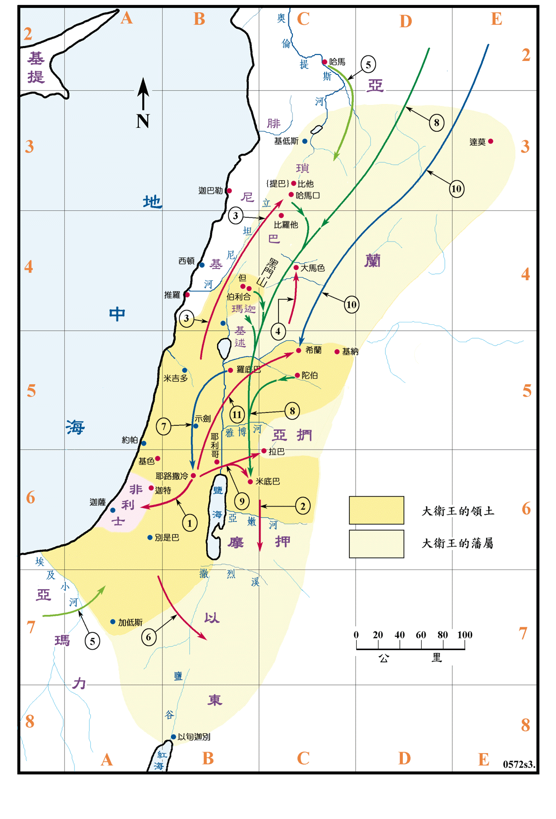 上图:大卫王的战功:1、征服非利士(撒下八1);2、征服摩押(撒下八2);3、征服琐巴(撒下八3-8);4、征服大马士革(撒下八5-6);5、哈马和亚玛力归顺,被征服的各国都进贡(撒下八9-12);6、征服以东(撒下八13-14);7、大卫恩待约拿单的儿子米非波设,将他从罗底巴接到耶路撒冷来住(撒下九);8、亚扪人召募亚兰人来到拉巴,要攻击大卫(撒下十1-8);9、约押兵分两路,打败亚扪人和亚兰人(撒下十9-14);10、亚兰人又从大河那边调兵,聚集在希兰(撒下十15-16);11、大卫领兵到希兰,把亚兰人打败,亚兰就归服(撒下十17-19)。