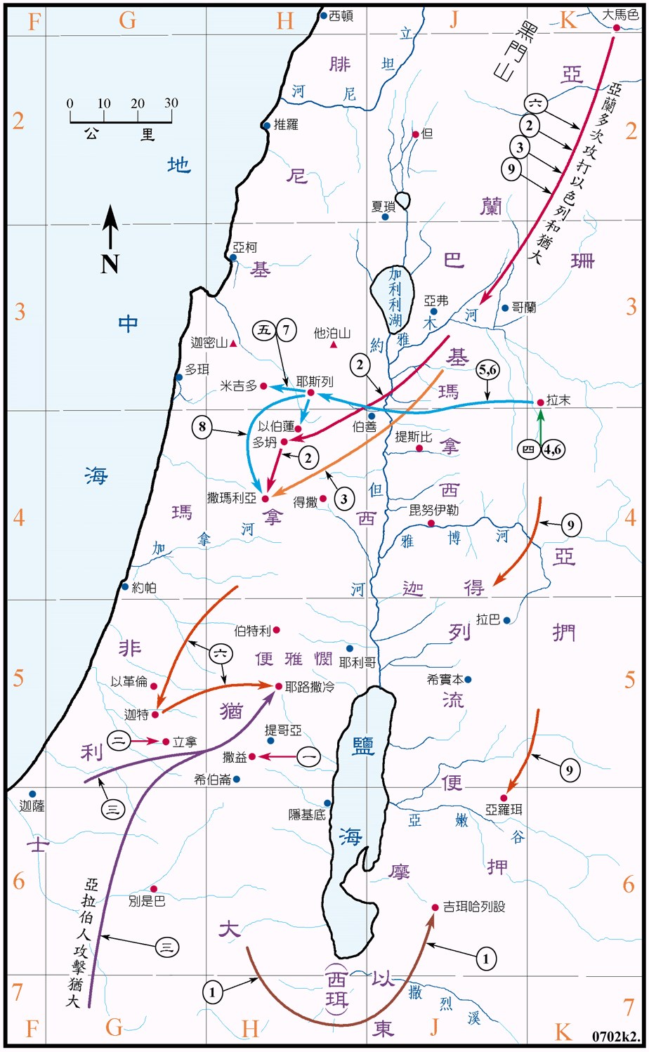 - 「割裂以色列国」(32节),意思是「缩小以色列的版图」。「亚嫩谷边的亚罗珥」(33节)是约旦河东基列地的南界(申二36),「巴珊」(33节)是基列地的北界。