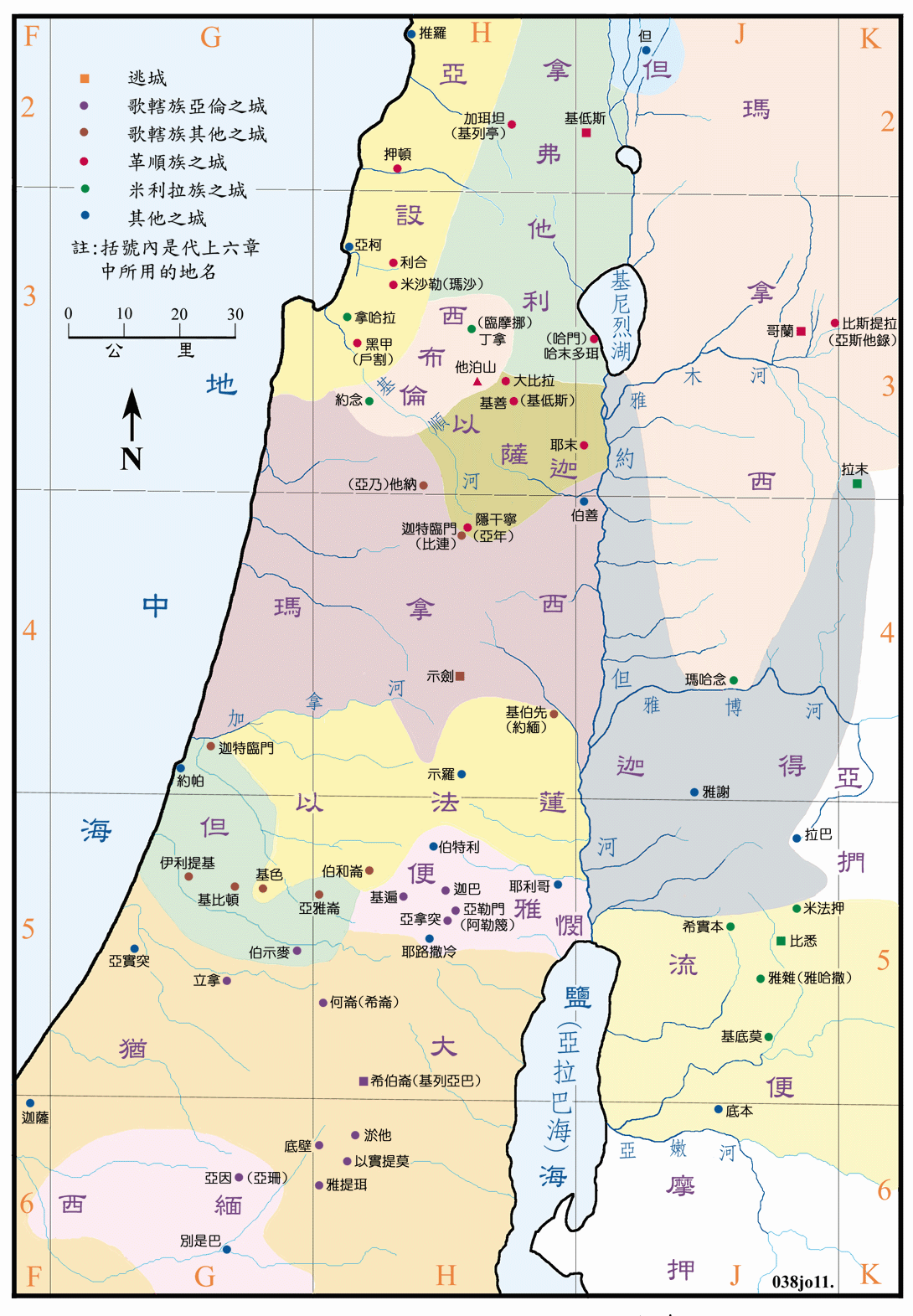 【代上六62】「革顺族按着宗族,在以萨迦支派的地中,亚设支派的地中,拿弗他利支派的地中,巴珊内玛拿西支派的地中,得了十三座城。」