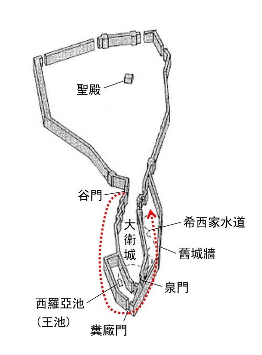 - 「泉门」(14节)可能在耶路撒冷城的东南角,「王池」(14节)可能是西罗亚池,「溪」(15节)可能指汲沦溪。