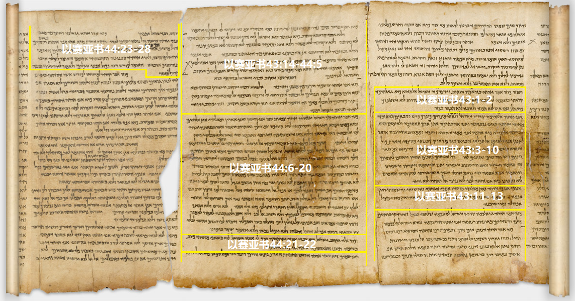 - 根据死海古卷《以赛亚书》羊皮卷(The Great Isaiah Scroll,1QIsaa)的分段方法,四十三-四十四章可以组成一个交错对称的结构: