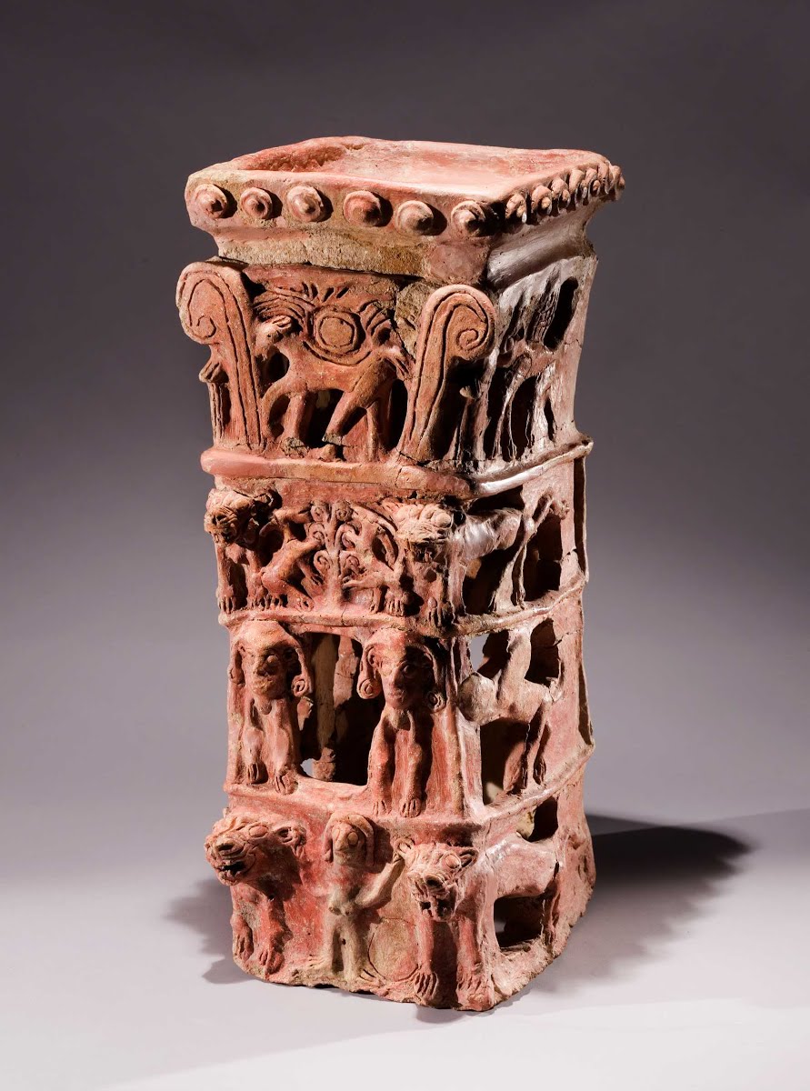上图:以色列他纳出土主前10世纪祭台(Taanach Cult Stand),现存于耶路撒冷以色列博物馆。祭台的最下层是亚舍拉,左右各有一只狮子;第二层是两只牛犊;第三层是生命树,可能就是「青翠树」(赛五十七5);最上层是一匹背着的带翼日轮的马,可能就是「向日头所献的马」(王下二十三11)。
