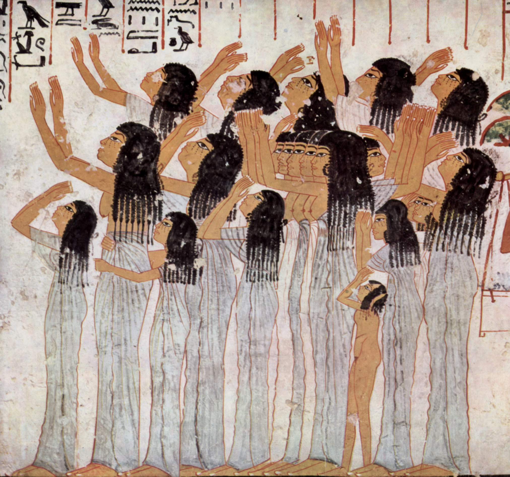 上图:古埃及壁画中的专业哭丧女,出土于主前1411-1375年的古埃及第十八王朝贵族Ramose的墓中(TT55)。专业哭丧是古代美索不达米亚、埃及和地中海东部流传甚广的习俗,埃及古墓的壁画浮雕中有很多专业哭丧的女性。有些哭丧女不但哀悼死人,更为死而复活的神祇、如搭模斯哀哭(结八14)。