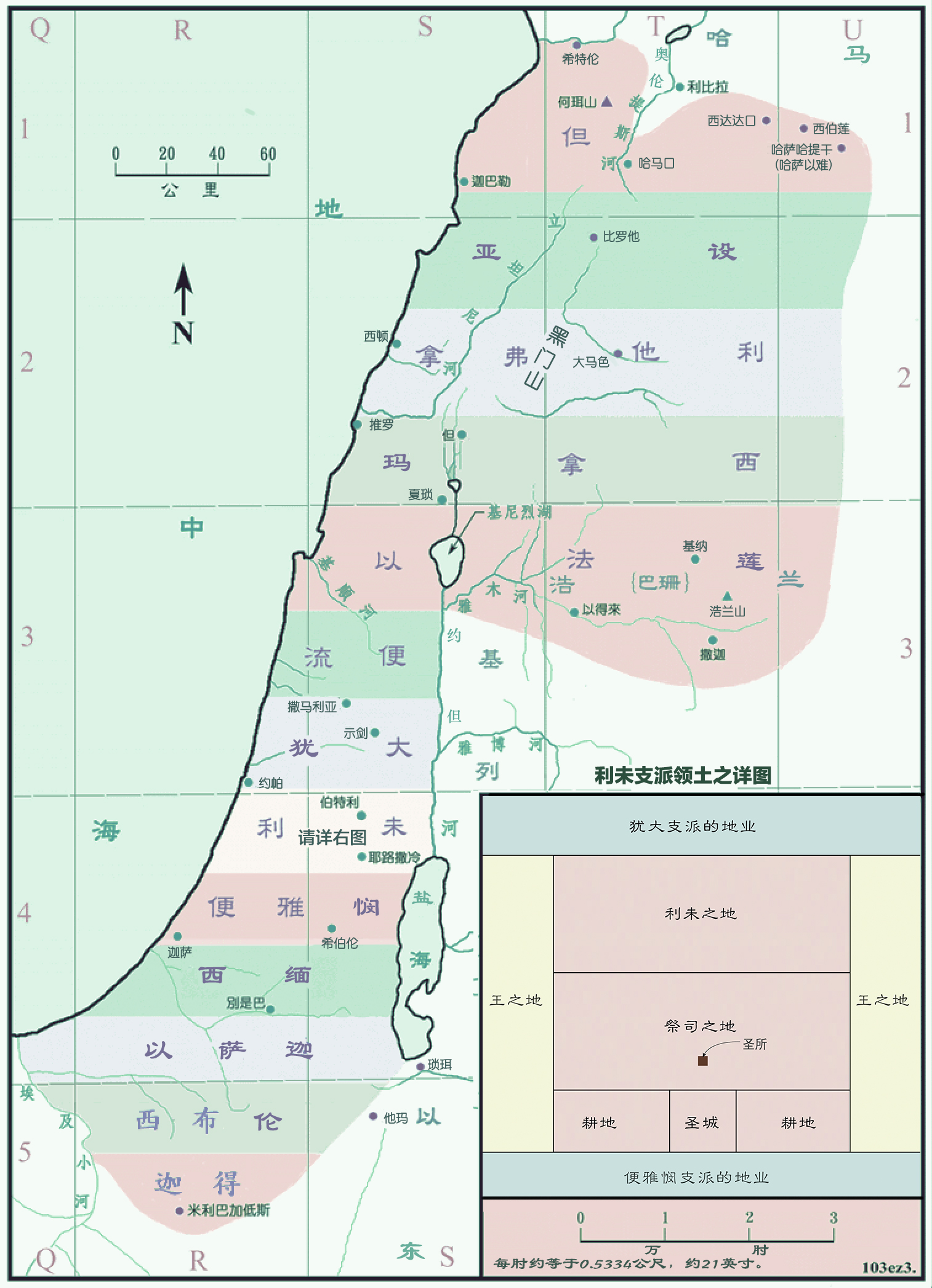 - 「所当献的供地」南北「宽二万五千肘」(8节),包括「圣供地连归城之地」(21节)和归王之地。其中「圣供地连归城之地,是四方的:长二万五千肘,宽二万五千肘」(20节),从北到南包括: