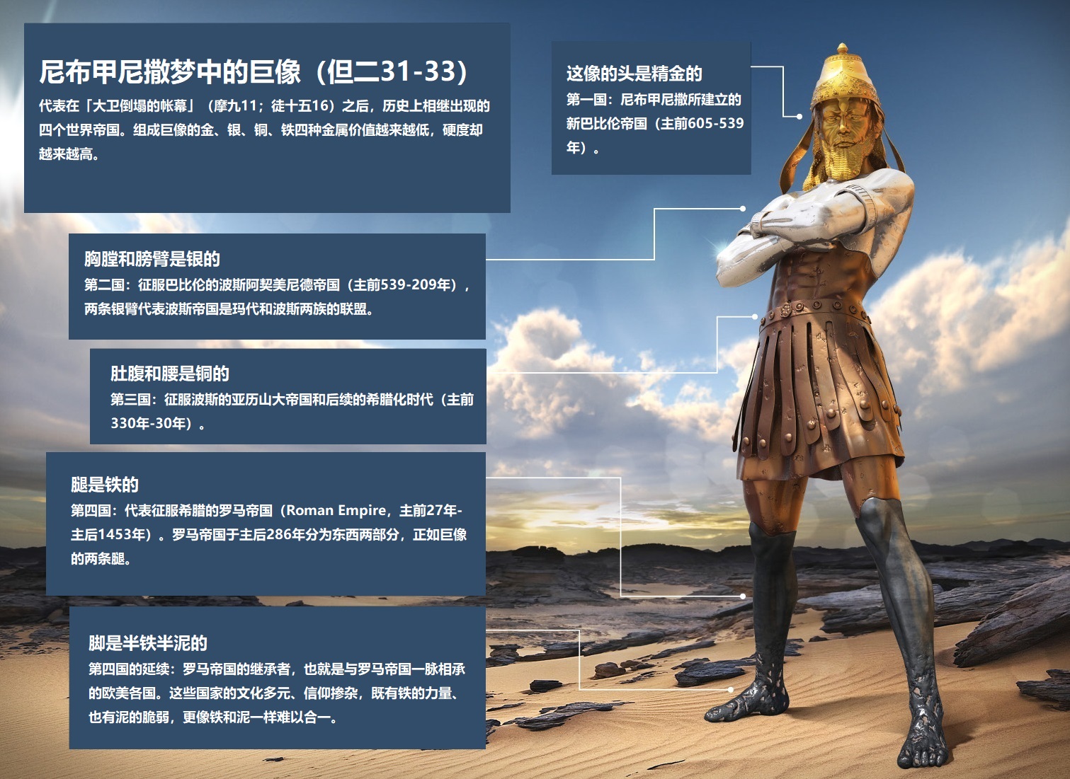 - 尼布甲尼撒梦中的巨像,代表在「大卫倒塌的帐幕」(摩九11;徒十五16)之后,历史上相继出现的四个世界帝国。这四大帝国全盛时期的军事力量都非常强大、难分伯仲。「金、银、铜、铁」的硬度并非代表军事的强弱,而是象征统治能力的高低。