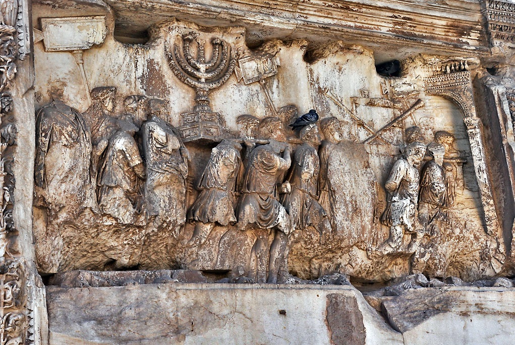 上图:罗马提多凯旋门的浮雕,描绘罗马士兵扛着从耶路撒冷圣殿掳来的金灯台、长号和陈设饼桌。多米田皇帝在他哥哥提多皇帝去世后不久,建了一座大理石单拱凯旋门,以纪念提多率军于主70年摧毁耶路撒冷和第二圣殿,平息了主后66年开始的犹太人起义。直到今天,许多犹太人拒绝从拱门下经过。1948年以色列复国时,大批人群从罗马犹太社区沿着与古罗马凯旋式相反的方向通过提多凯旋门。