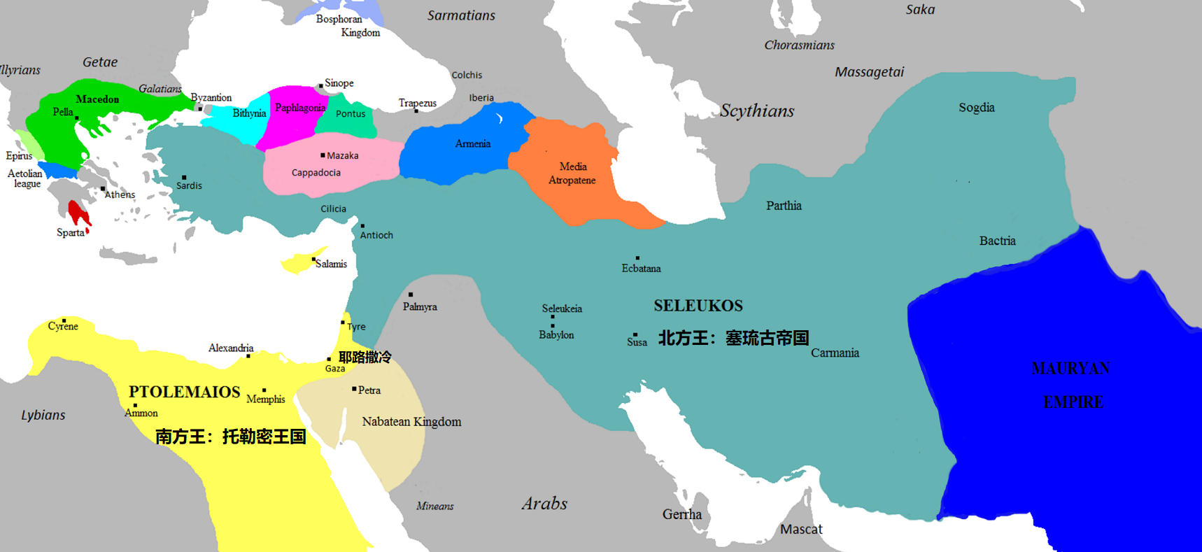 - 在继承亚历山大帝国的四国之中,与选民有关的主要是南方埃及的托勒密王国和北方叙利亚的塞琉古帝国。这两国时而联合、时而争战,反反复复。5-35节所预言的六次叙利亚战争(Syrian Wars,主前274-168年)持续了两百年,双方军队往返争战都要经过犹大和耶路撒冷,给神的百姓造成了很大影响。