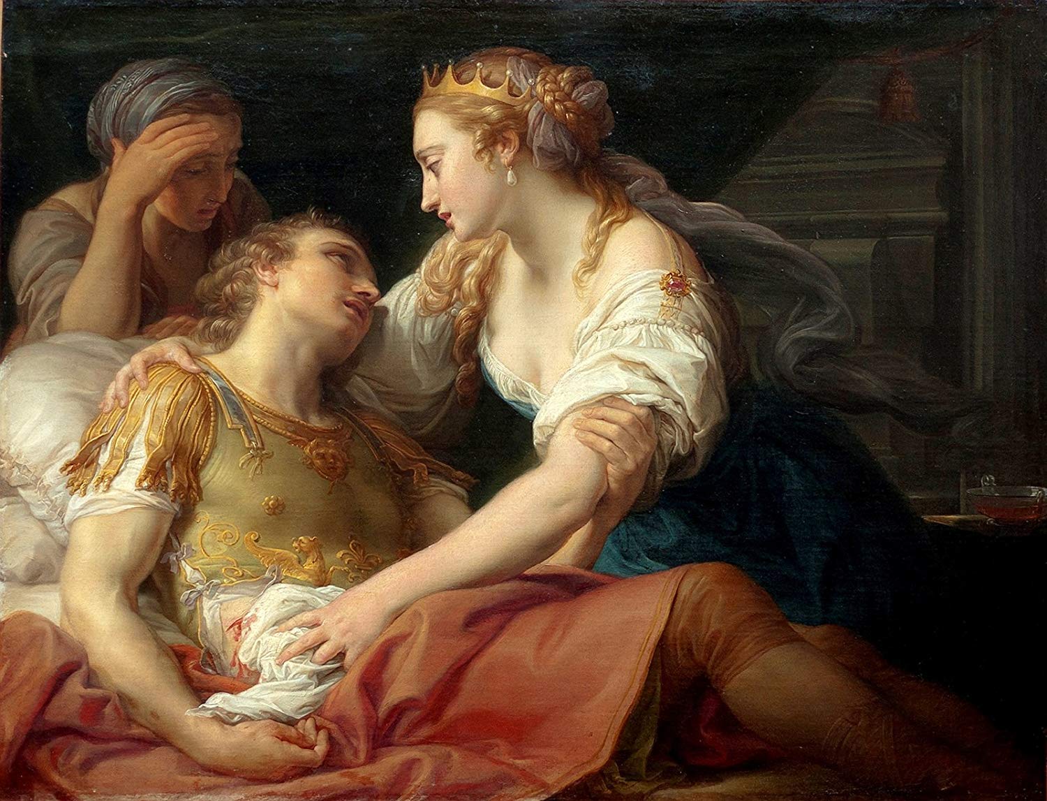上图:油画《马克·安东尼之死 The Death of Marc Anthony》,十八世纪意大利画家蓬佩奥·巴托尼(Pompeo Girolamo Batoni,1708-1787年)绘制。描绘主前30年8月,屋大维从东方入侵埃及,安东尼的盟友庇那留倒戈、从西方攻击安东尼,安东尼无力回天、被包围在亚历山大港。无处可逃的安东尼在误以为情人埃及艳后克娄巴特拉自杀后,伏剑自刎却未立死,后来被带到克娄巴特拉身边、死在她怀中。不久,被屋大维俘虏的克娄巴特拉也自杀了。