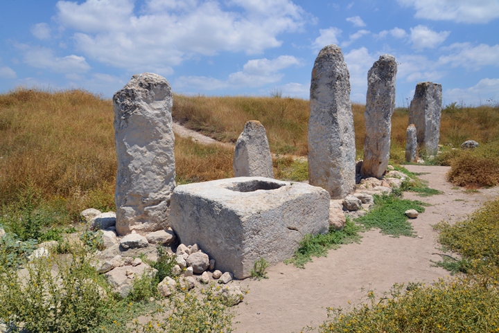 上图:考古学家在基色迦南人的圣所中发现了十根石柱,方石墩上的圆孔可能是用来立「木偶」的。在迦南宗教中,石柱代表生殖崇拜中的男神,被称为「柱像」。树木代表女神,被称为「木偶」或「亚舍拉柱」。男神和女神的名字及和相互之间的关系,不同地方的迦南人有不同的说法。男神的名字通常是「巴力 Baal),但不同的地方又有地方特色,如「巴力·毗珥」、「巴力·比利土」、「巴力·西卜」,统称「诸巴力 Baals」。女神的名字有的地方叫「亚纳特 Anath」、有的地方叫「亚舍拉 Asheroth」、有的叫「亚斯她录 Ashtaroth」,有的地方认为她是巴力的妻子、有的地方认为她是巴力的母亲。