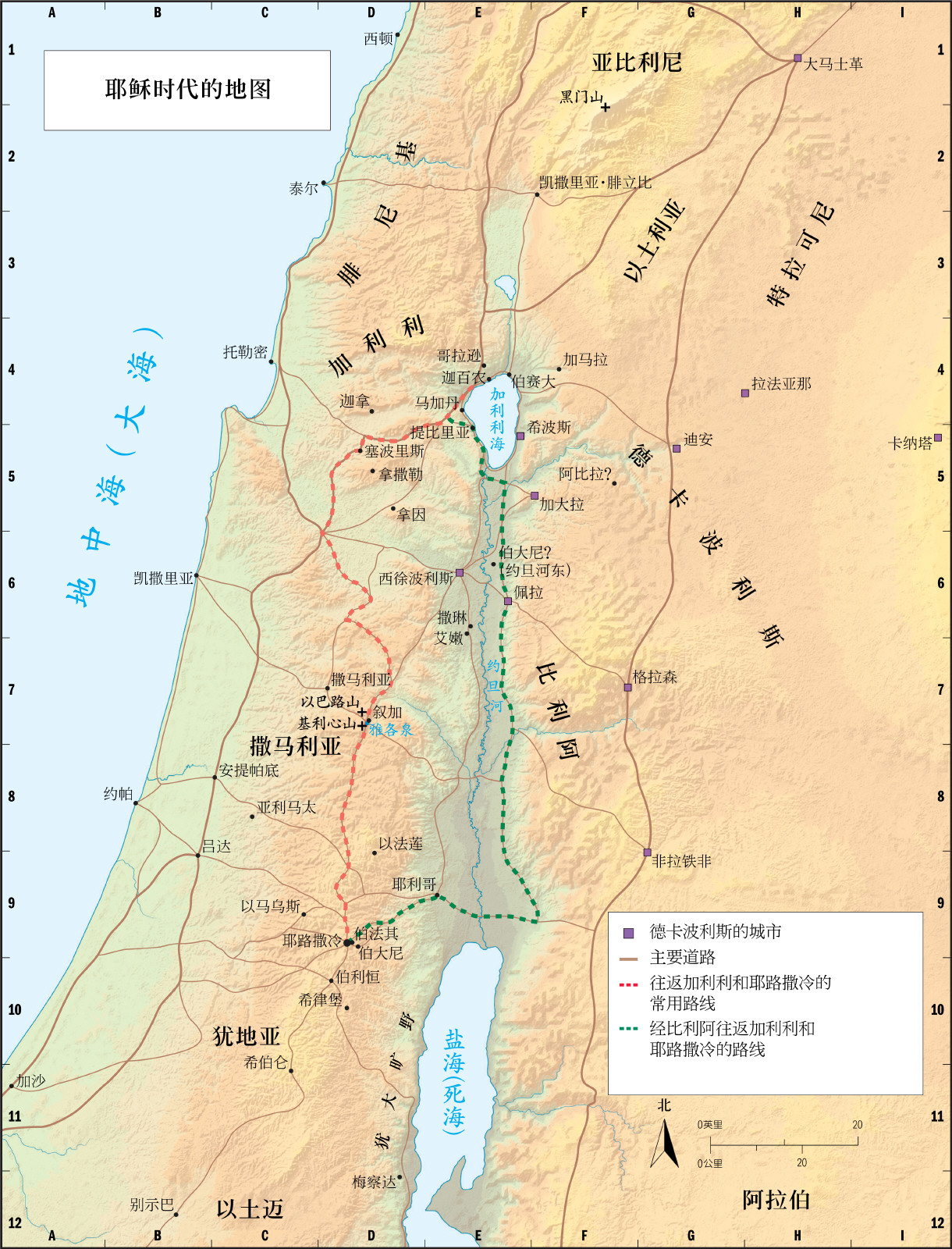 上图:耶稣时代的犹太人地区。罗马帝国在主前63年征服了犹太地区,但犹太人在罗马帝国的统治下仍有一定的自治权。罗马封有一半犹太血统的以东人后裔大希律做治理犹太地区的小王,其辖区包括犹太、加利利、比利亚和特拉可尼四个省,其中犹太省又分成撒马利亚、犹太和以土买等三个地区。大希律于主前37-主后4年在位,死后由三个儿子分别治理他的封地,亚基老分得犹太省,安提帕(小希律)分得加利利和比利亚,腓力分得特拉可尼。其中亚基老暴虐无道,作王十年后被罗马罢黜流放,改派罗马巡抚管理犹太省。