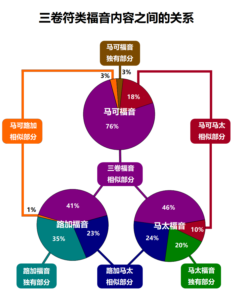 - 《马太福音》的20%、《马可福音》的3%和《路加福音》的35%,是这三者各自独有的部分。
