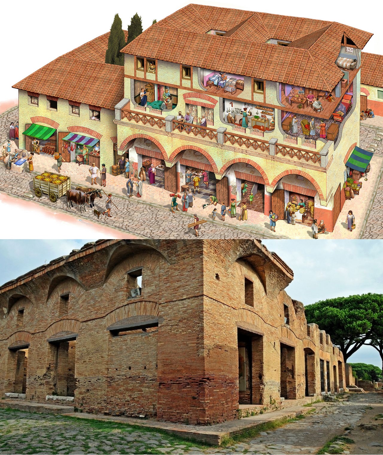 上图:新约时代罗马公寓楼示意图和古罗马港口城市奥斯提亚安提卡(Ostia Antica)出土的古建筑群遗迹。在古罗马的城市里,大部分居民都住在被称为Insulae的公寓楼里,现存最高的是五层楼,越上层的质量越差。少数富有的上流人士住在联排屋(Domus)里,在一、两天路程之外的乡村还可能有别墅(Villa)。在4世纪,当时罗马城里大约有4.2万至4.6万栋公寓楼,而3世纪后期只有1,790栋联排屋。初期教会聚会的地方,就是在这些公寓楼和联排屋里。
