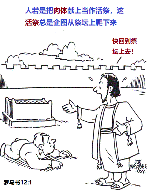 - 「当作活祭」并不是神需要我们向祂奉献什么,好像祂缺少了什么,「因为万有都是本于祂,倚靠祂,归于祂」(十一36);也不是神需要我们为祂做什么,因为「既是出于恩典,就不在乎行为」(十一6);更不是我们能为神做什么,因为我们的身体不过是「取死的身体」(七24),「我肉体之中,没有良善。因为立志为善由得我,只是行出来由不得我」(七18),根本不配作无瑕疵的祭牲(利一3,10;三1)。旧约的五种「祭」所预表的都是基督,神所要得着的是「效法祂儿子的模样」(八29)的人来彰显祂的荣耀。「活祭」不是我们能靠自己活出基督,而是借着毫无保留地向神交出自己的主权,神就使用我们这有瑕疵的、不配的身体为器皿,让基督自己在这器皿里活出来,让基督自己在这器皿里做成神所要做的工,成为神所悦纳的「馨香的火祭」(出二十九18)。