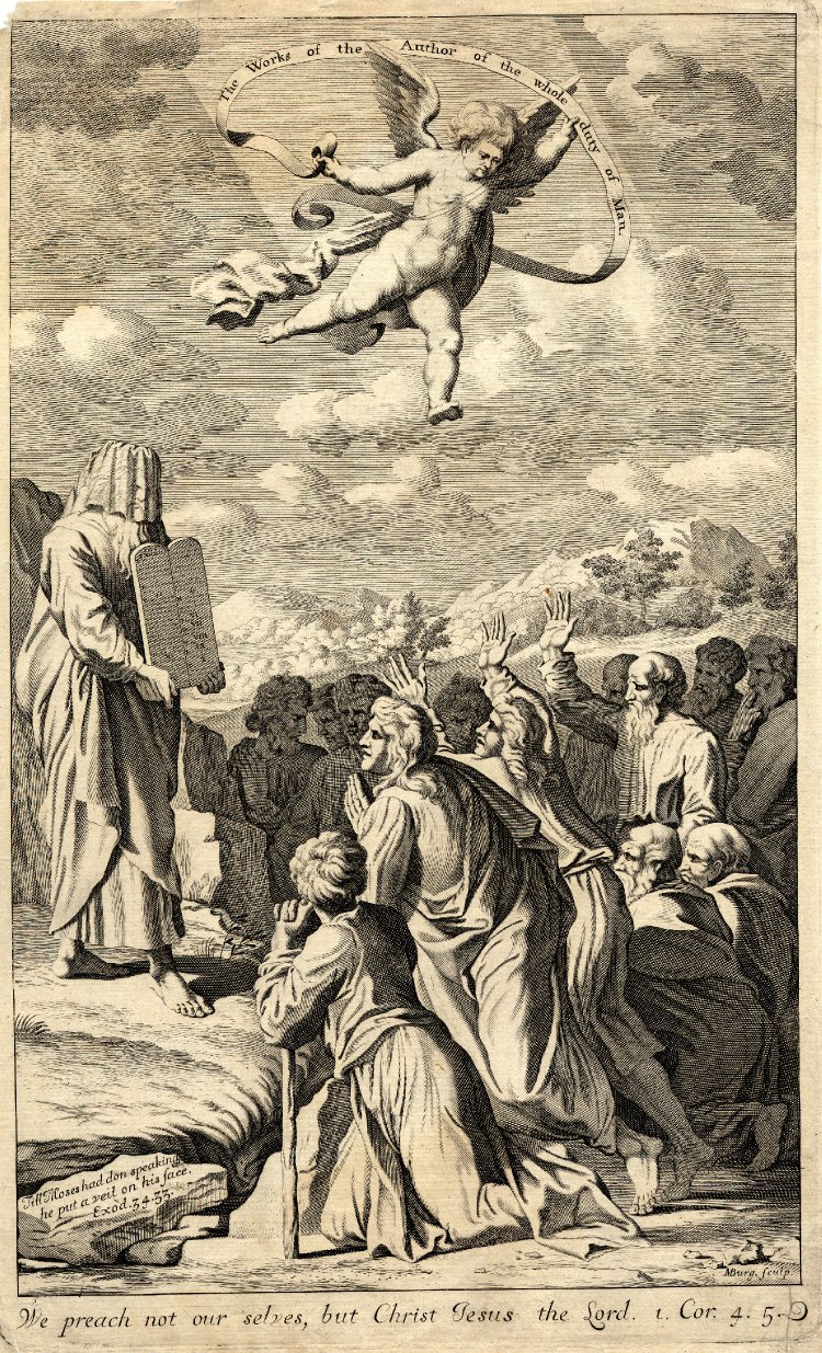 - 摩西拿着两块石版下山时,他的脸面因着与神的长久交通而反射神的荣耀发光(出三十四29),以色列人看见了就怕挨近他(出三十四30)。人既然不能在律法前睁开眼,摩西只好用帕子蒙上脸和他们说话(出三十四33-34),让以色列人可以在他面前站立。但「这荣光原是渐渐退去的」(7节),正如律法只是神工作中的一个阶段性法则,完成了它的历史任务以后,就不再对人发生管理和引导的作用。