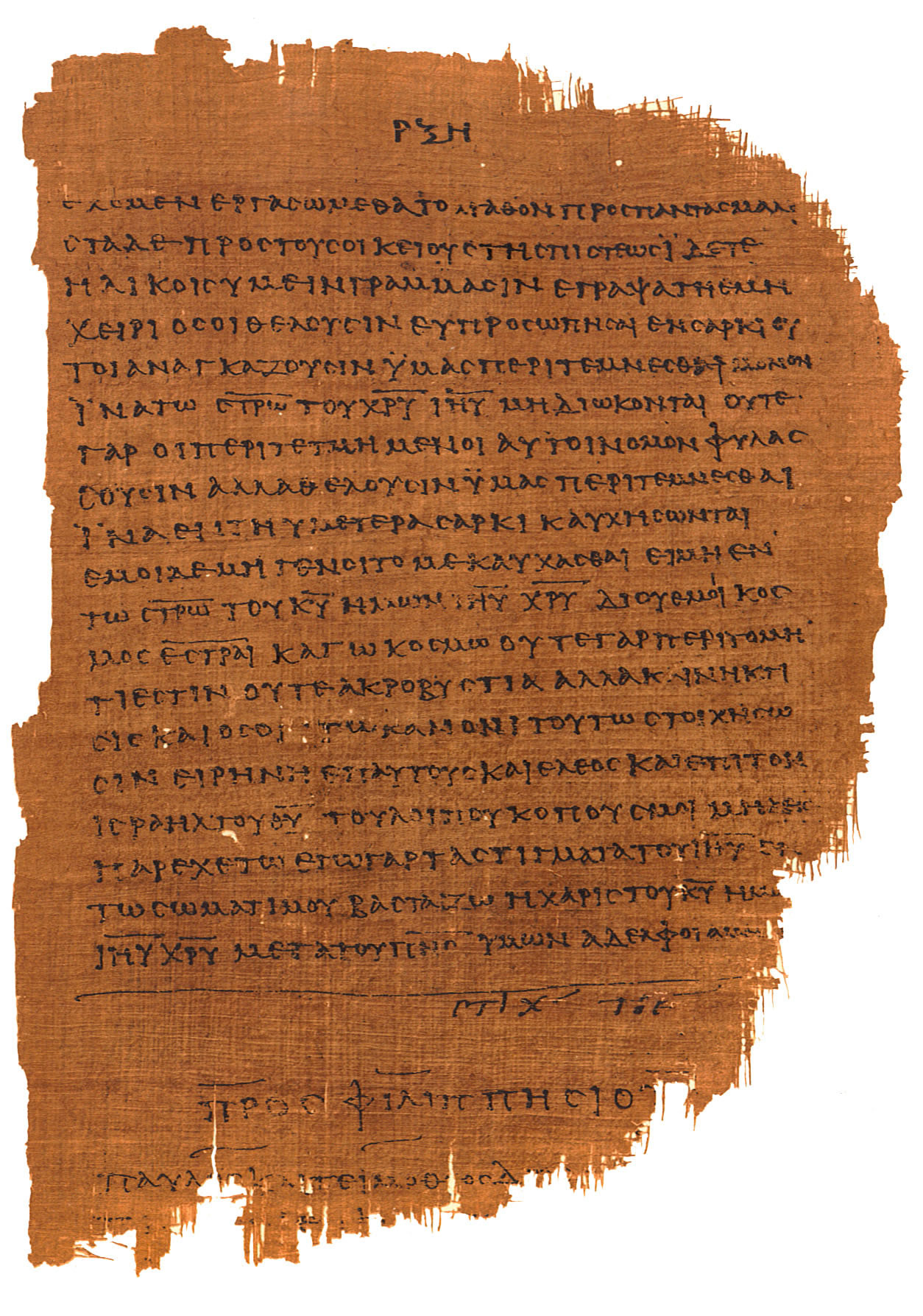 上图:蒲草纸抄本 P46中的《加拉太书》第六章。蒲草纸抄本 P46(Papyrus 46)又称为切斯特·比替蒲草纸抄本第2号(P. Chester Beatty II),是现存最早的希腊文新约抄本,成书年代大约在主后175至225年之间。