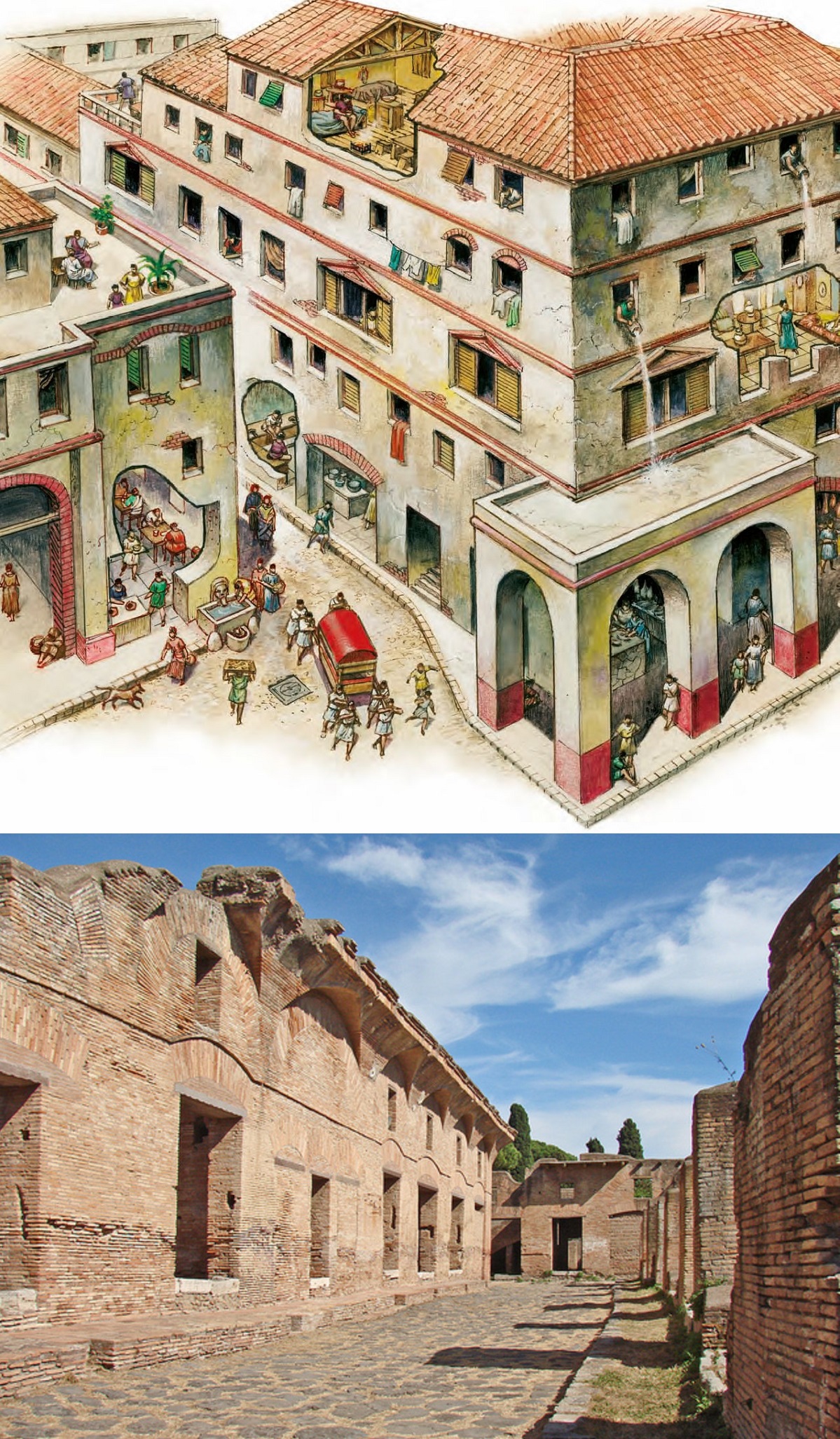上图:新约时代罗马公寓楼示意图和古罗马港口城市奥斯提亚安提卡(Ostia Antica)出土的古建筑群遗迹。在古罗马的城市里,大部分居民都住在被称为Insulae的公寓楼里,现存最高的是五层楼,越上层的质量越差。少数富有的上流人士住在联排屋(Domus)里,在一、两天路程之外的乡村还可能有别墅(Villa)。在4世纪,当时罗马城里大约有4.2万至4.6万栋公寓楼,而3世纪后期只有1,790栋联排屋。初期教会聚会的地方,就是在这些公寓楼和联排屋里。