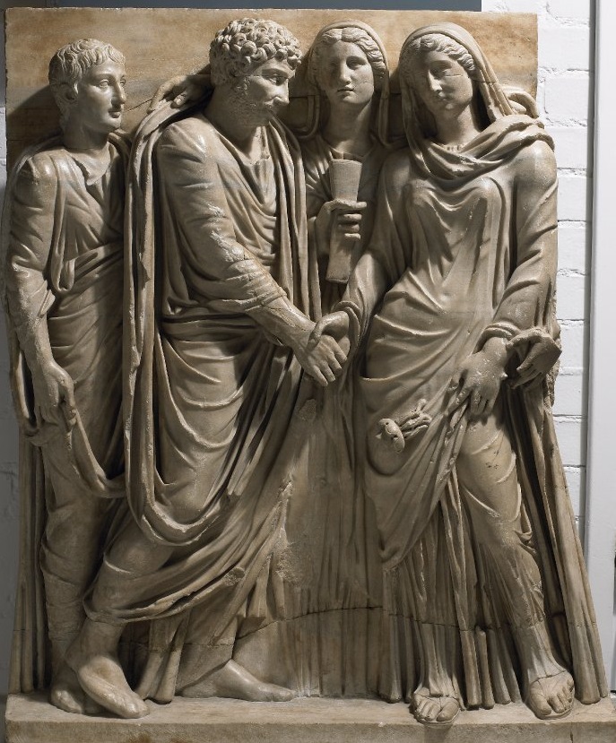 上图:古罗马婚礼,现藏于大英博物馆。古代希腊-罗马的婚姻是严格的一夫一妻制,妻子在经济上比较独立,社会鼓励寡妇或离婚的妻子再婚。寡妇可以继承丈夫的遗产,穷人的寡妇很穷,富人的寡妇很富。有些多次结婚的寡妇甚至积累了巨大的财产,被许多男人所追求。因此,大部分普通的寡妇是「真为寡妇的」(提前五3),但有些则是「好宴乐的寡妇」(提前五6)。