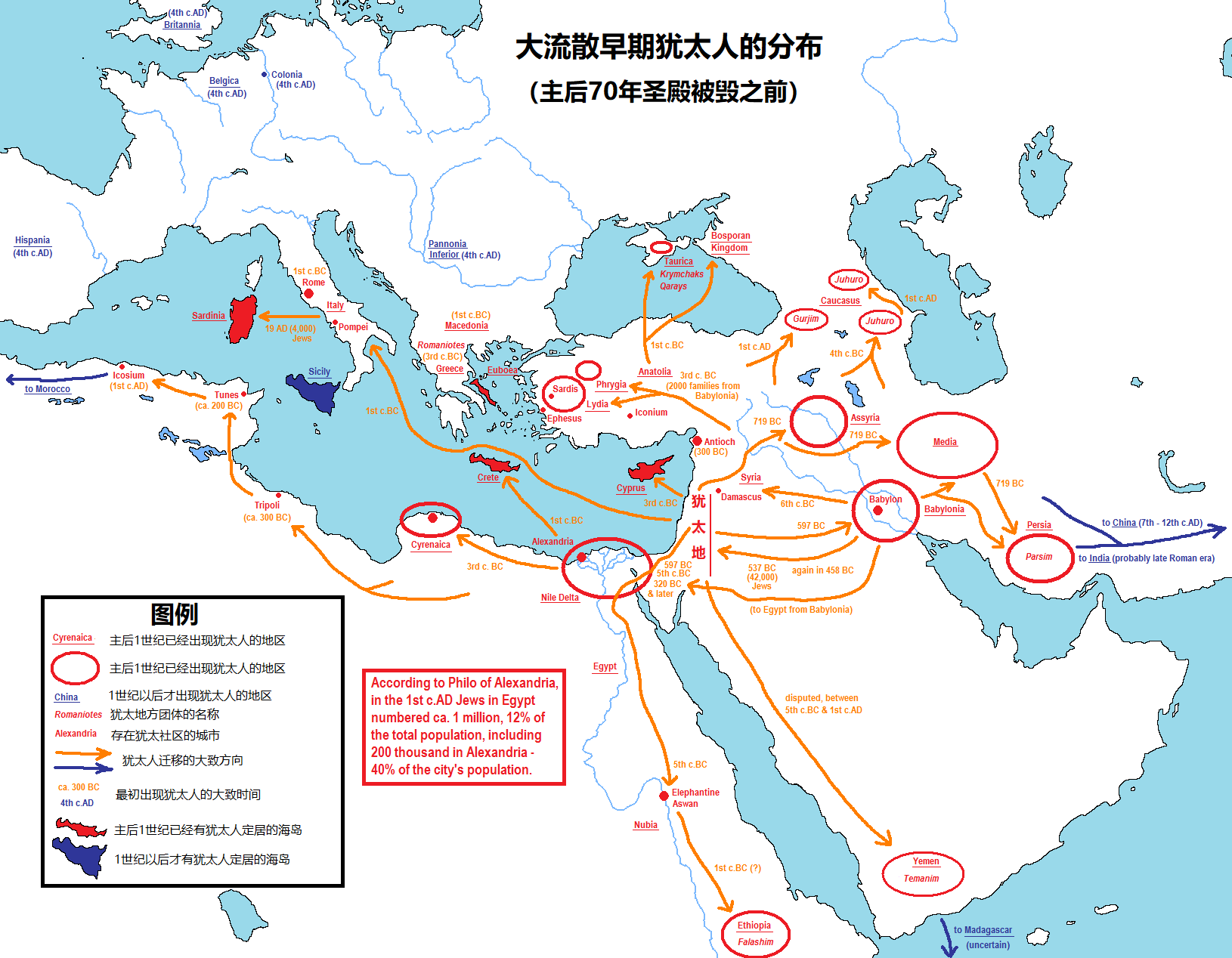 上图:主后70年之前犹太人在罗马帝国和帕提亚帝国的分布。每年的逾越节、五旬节和住棚节,都有许多各地的犹太人回到耶路撒冷过节。主耶稣复活之后的五旬节当天,各地到耶路撒冷过节的人中有三千人信主(徒二41),此后「主将得救的人天天加给他们」(徒二47)。这些门徒把福音带回本地,有犹太人的地方,就有福音传到那里。