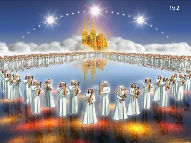 【启十五2】「我看见仿佛有玻璃海,其中有火搀杂。又看见那些胜了兽和兽的像并它名字数目的人,都站在玻璃海上,拿着神的琴,」