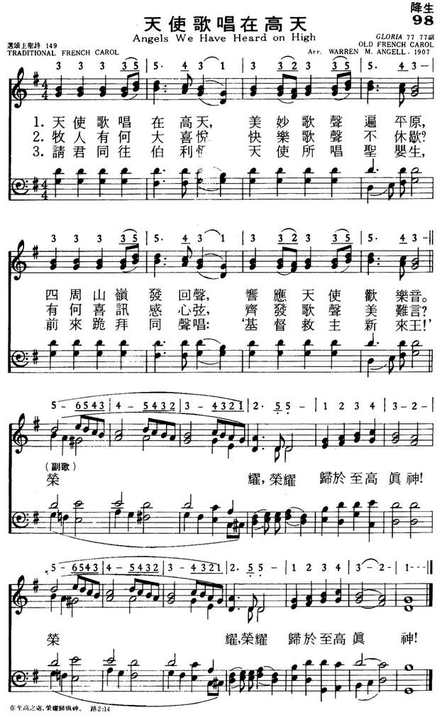 “天使歌唱在高天”是知名圣诞赞美诗,此首歌曲是纪念圣经路加福音中,耶稣降生世界时,伯利恒城外一位牧羊人遇见天空众多天使齐声颂扬救主降临的故事。原为法国人人熟知的颂赞曲”Les Anges dans nos campagnes”,歌名原意是指”天使降临我城邦”的意思,原作者无可考,据说是于法国的朗得多克开始传出来。这首歌曲经过多次的校对与修正,最常见的英译版本是1862年由罗马教廷的James Chadwick主教所校对修正的。