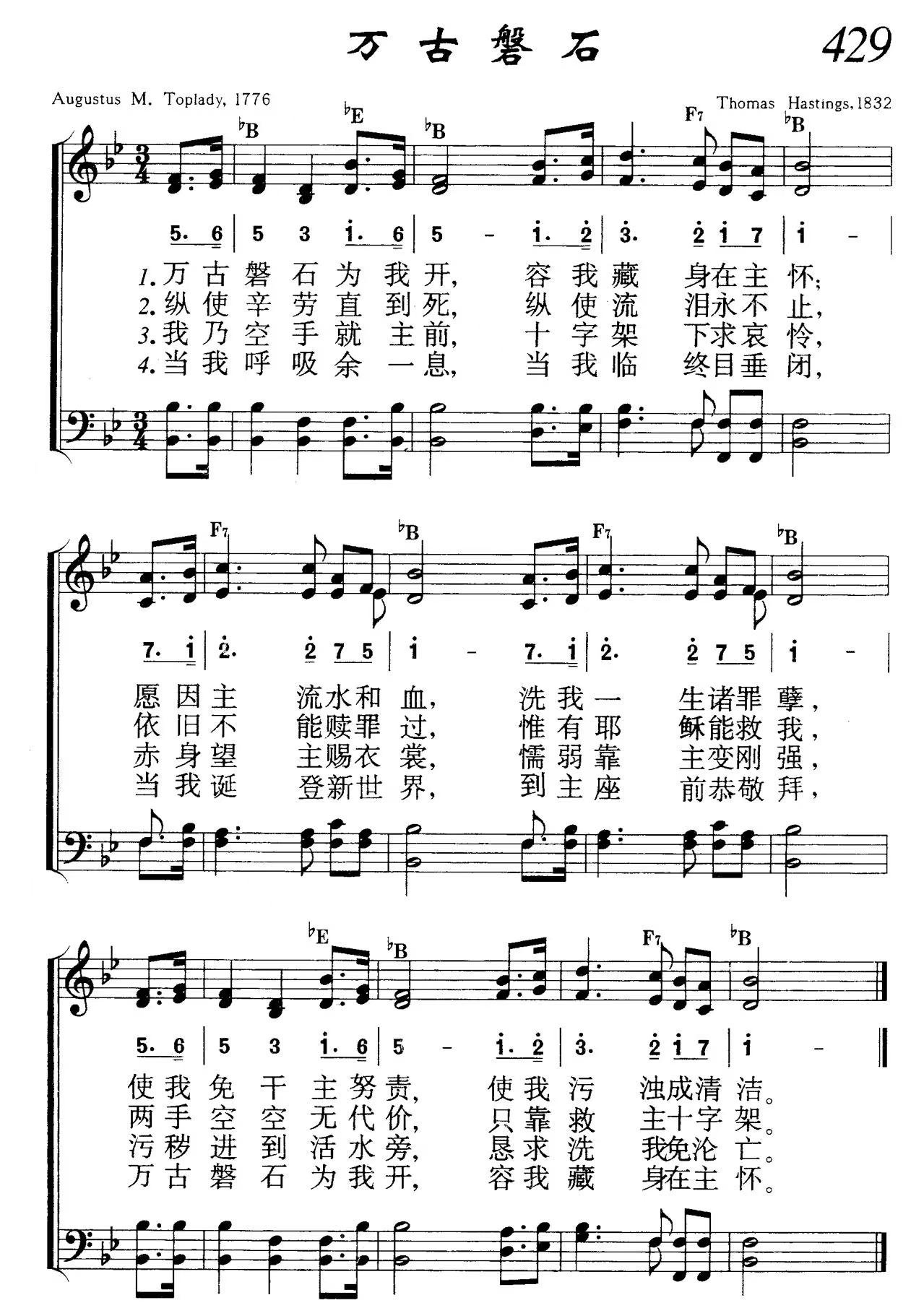 《万古磐石》作于1776年,被圣诗典考称为“英文四大杰作之一”。故事的背景有二个传说。有一次Toplady在旅途遇到狂风,无法前行,就躲入一大石穴内,洞外狂风呼啸,洞内安稳无虞。他想到主耶稣是普世万人的拯救磐石,就在洞内写下了这首旷世名诗。另一个传说是,有一天他在郊野散步,看到三只雏鸟,藏身在盘石穴中,触发了他的灵感,遂写此诗。